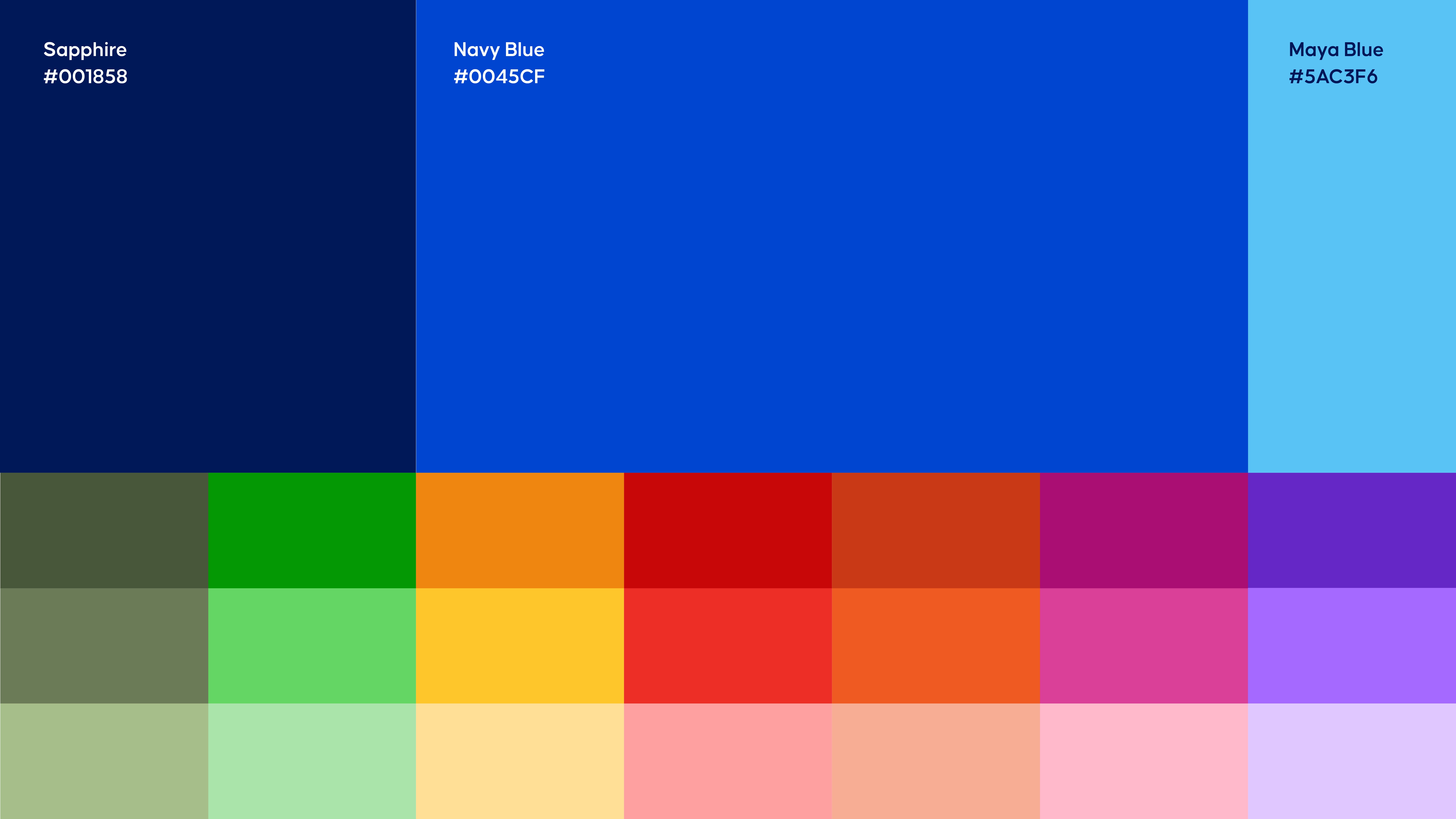 The way I kept it controlled was through usage hierarchy. The navy and electric blue do the heavy lifting. Everything else is accent — used to differentiate categories, signal emotion, add energy in the right moments. It's a system, not a free-for-all. The palette earns its complexity because it's governed.
